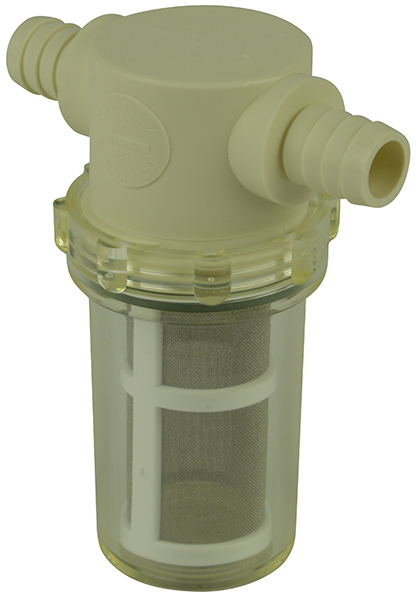 1/2 Hose Barb Mini Series, Nylon top, Clear Bowl, Viton, 80 Mesh caged ss screen.