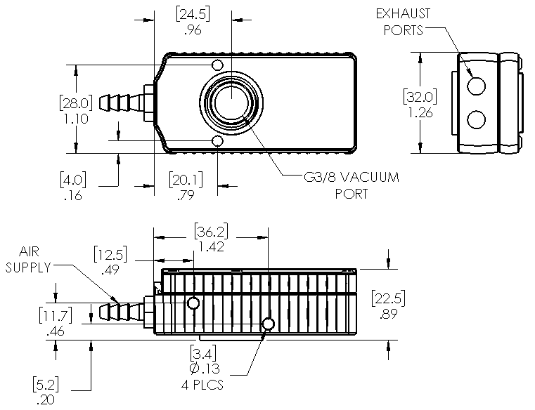 Vacuum Flow(SCFM): 1.2 Vacuum Port: 3/8" NPSF Supply Port: M5 Air Consumption: .42 Max Vac -inHg": 25 Weight(lbs)": 0.072