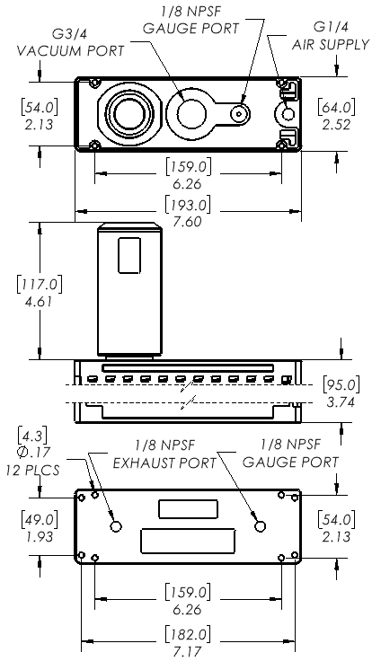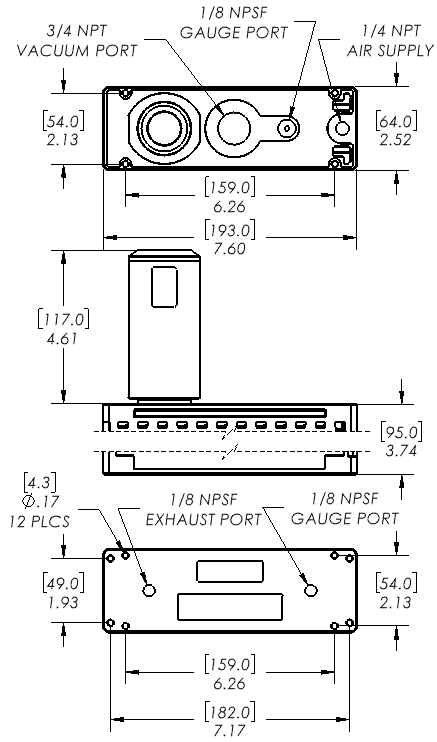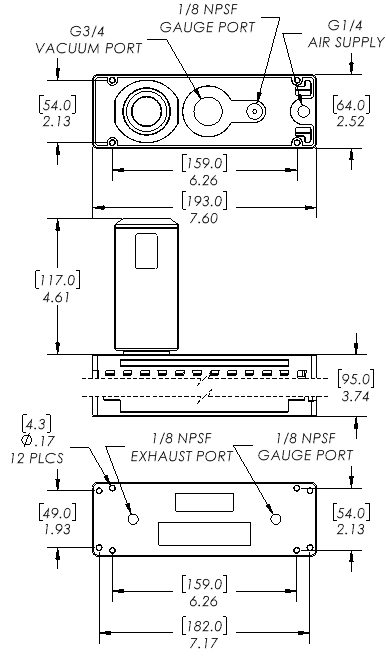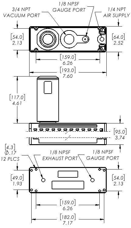 Multi-stage vacuum generator. 25.42 scfm, 27.5hg
