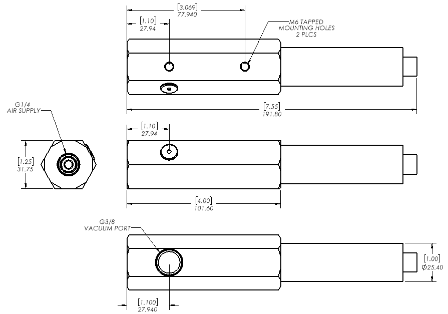 | Regulator Image | Description / Model # | Price | Type | Vacuum Port | Vacuum Flow | Air Consumption | Max Vac -"Hg | Dimensional Drawing |