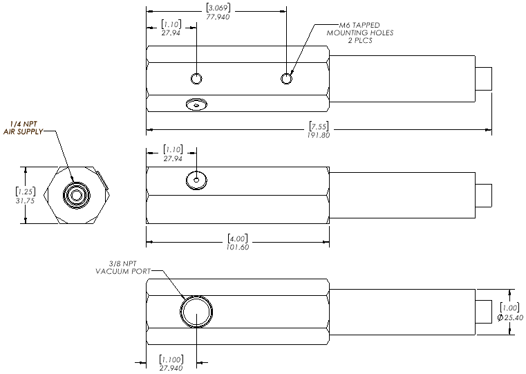 Miniature Vacuum Generator, Hex Style, w/Straight Through Silencer, 20Hg, 1.4 SCFM, NPT